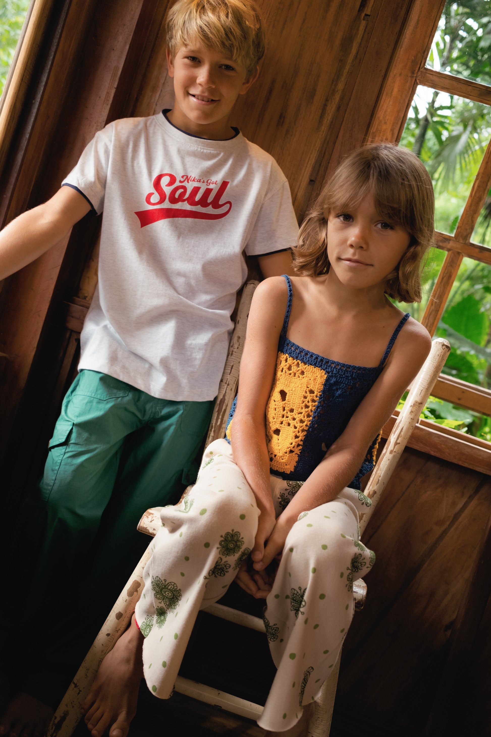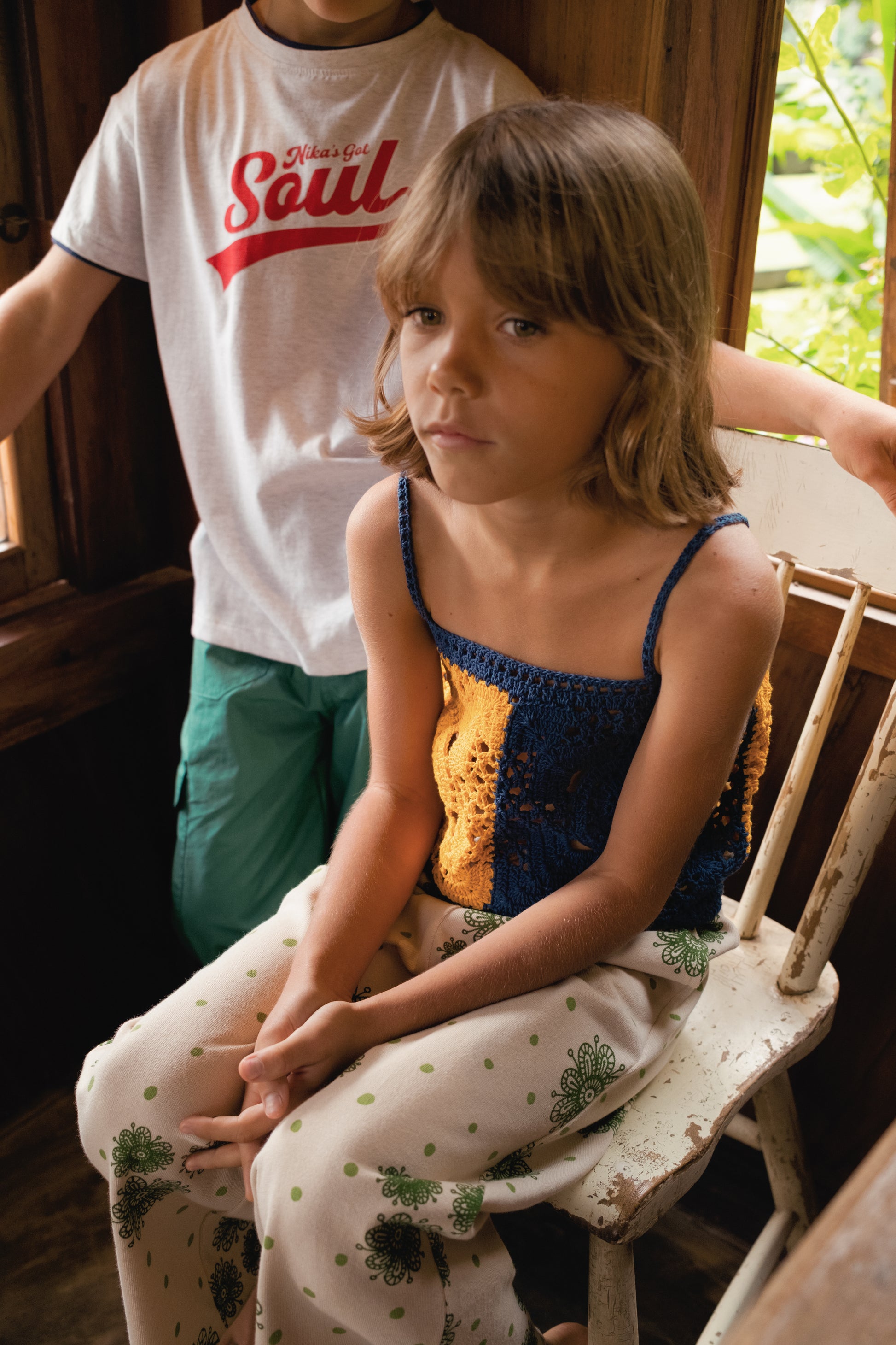 Hand-crocheted tube top design with dual contrasting colors for a standout look. Finished with a delicate lace square panel, this top brings a charming artisanal touch to any warm-weather outfit