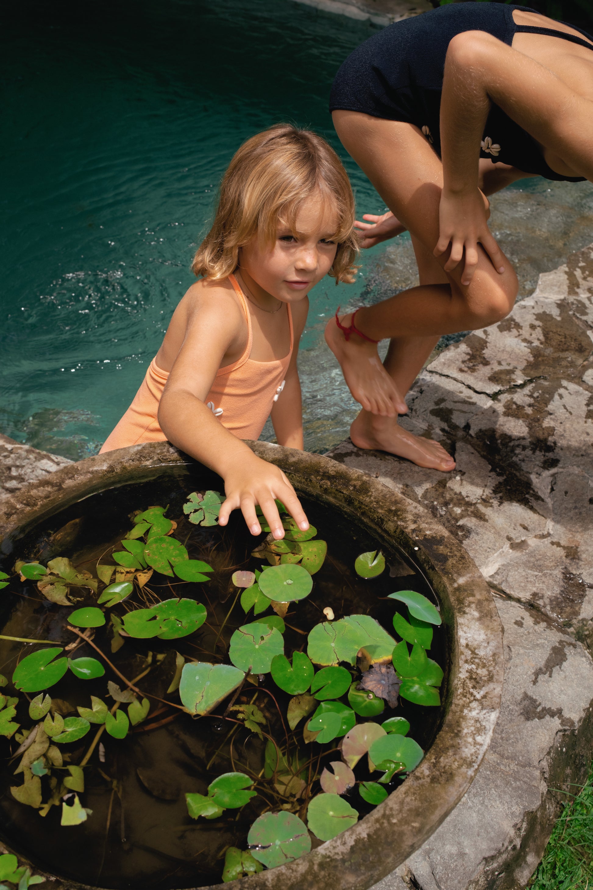 Swimsuit with cross back featuring pallenteria fabric from Econyl for a smooth, comfortable fit, with decorative shell flowers stiched on the front