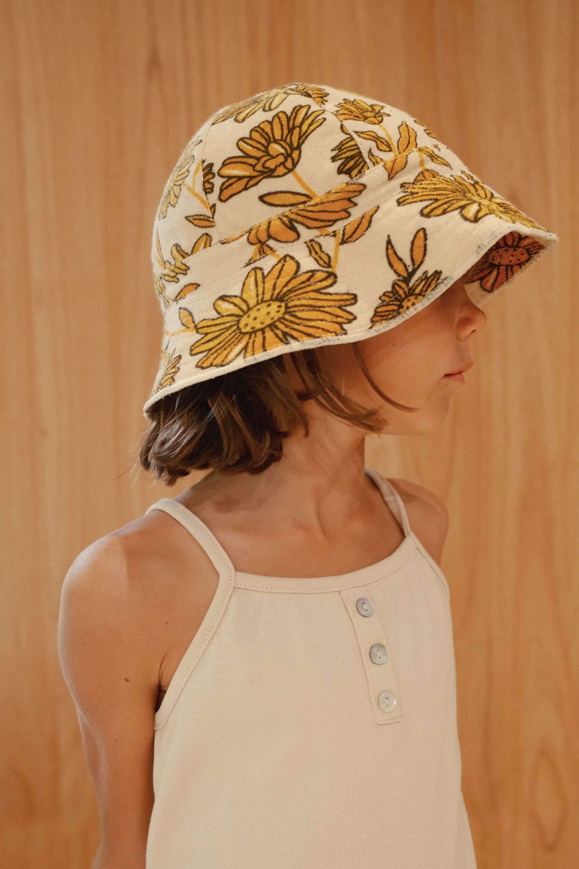 Sunflower-printed bucket hat made from quick-dry terry fabric for all-day comfort and sun protection